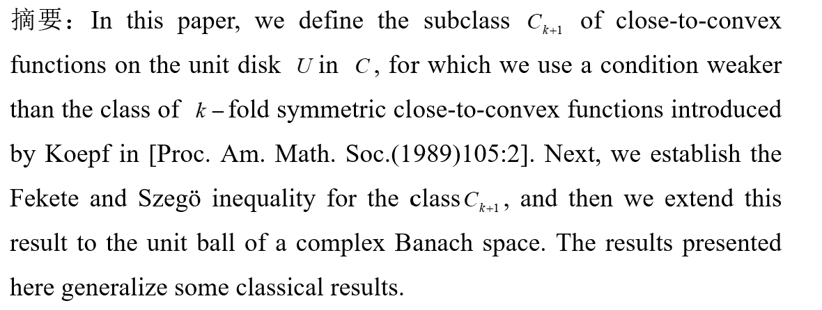 摘 要:This paper is devoted to studying geometric properties and analytic properties of g-starlike mappings of complex order λ. By using Loewner chains, we obtain the growth theorems for g-starlike mappings of complex order λ on the unit ball in reflexive complex Banach spaces, which generalize some results of Graham, Hamada and Kohr. As applications, several different kinds of distortion theorems for g-starlike mappings of complex order λ are obtained. Finally, we prove that the Roper-Suffridge extension operators preserve the property of g-starlike mappings of complex order λ in complex Banach spaces, which generalizes many classical results.