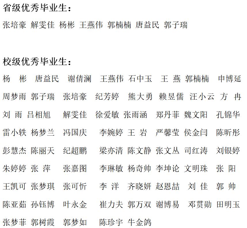 按照河南省教育厅关于评选<<河南省普通大中专学校2020年优秀应届毕业生通知>>要求及<<中文色情 全日制普通本科生奖励办法>>的有关规定,2020届毕业生通过民主评议,特评出省级校级优秀毕业生和优秀实习生若干,予以公示如下: