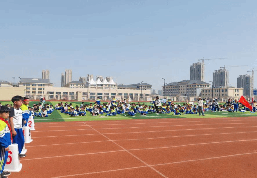 上午,附属小学各班班主任带着学生有序进入操场,小朋友们穿着整齐的校服,充满活力和笑容,挥舞着旗帜,展现出昂扬的斗志。整个运动场上,红棕色的跑道,绿色的草坪和活泼可爱的小朋友交织成一道美丽的风景线。