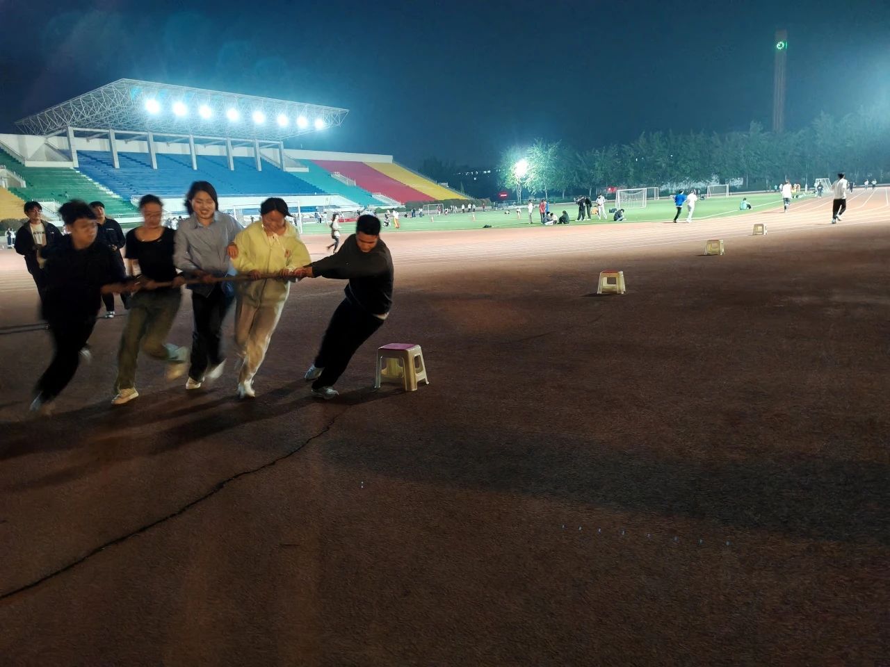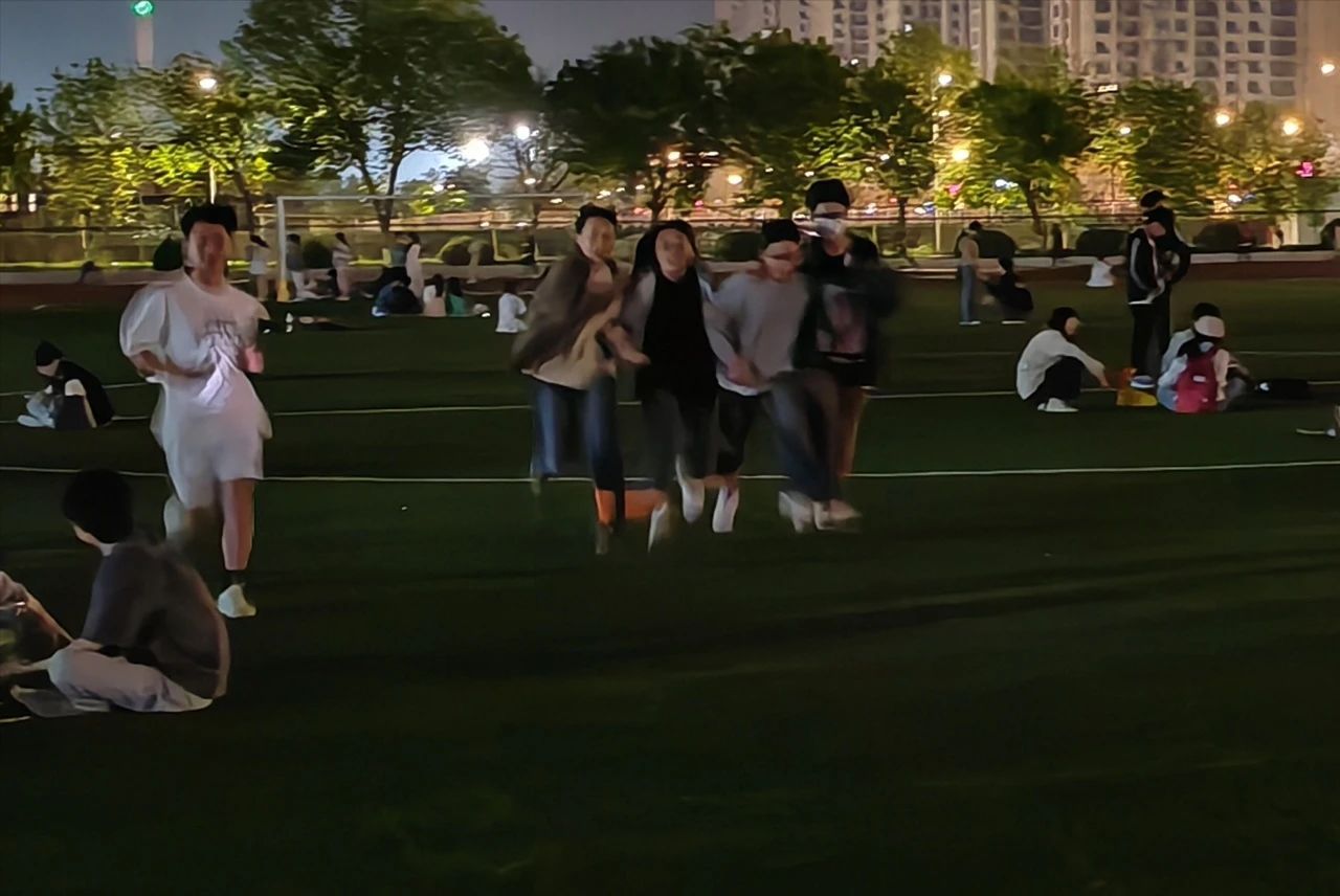 的四人小队腿部互相捆绑,共同完成比赛。他们密切配合、步调一致,他们在训练中不断磨合默契,以应对比赛中可能遇到的各种挑战。