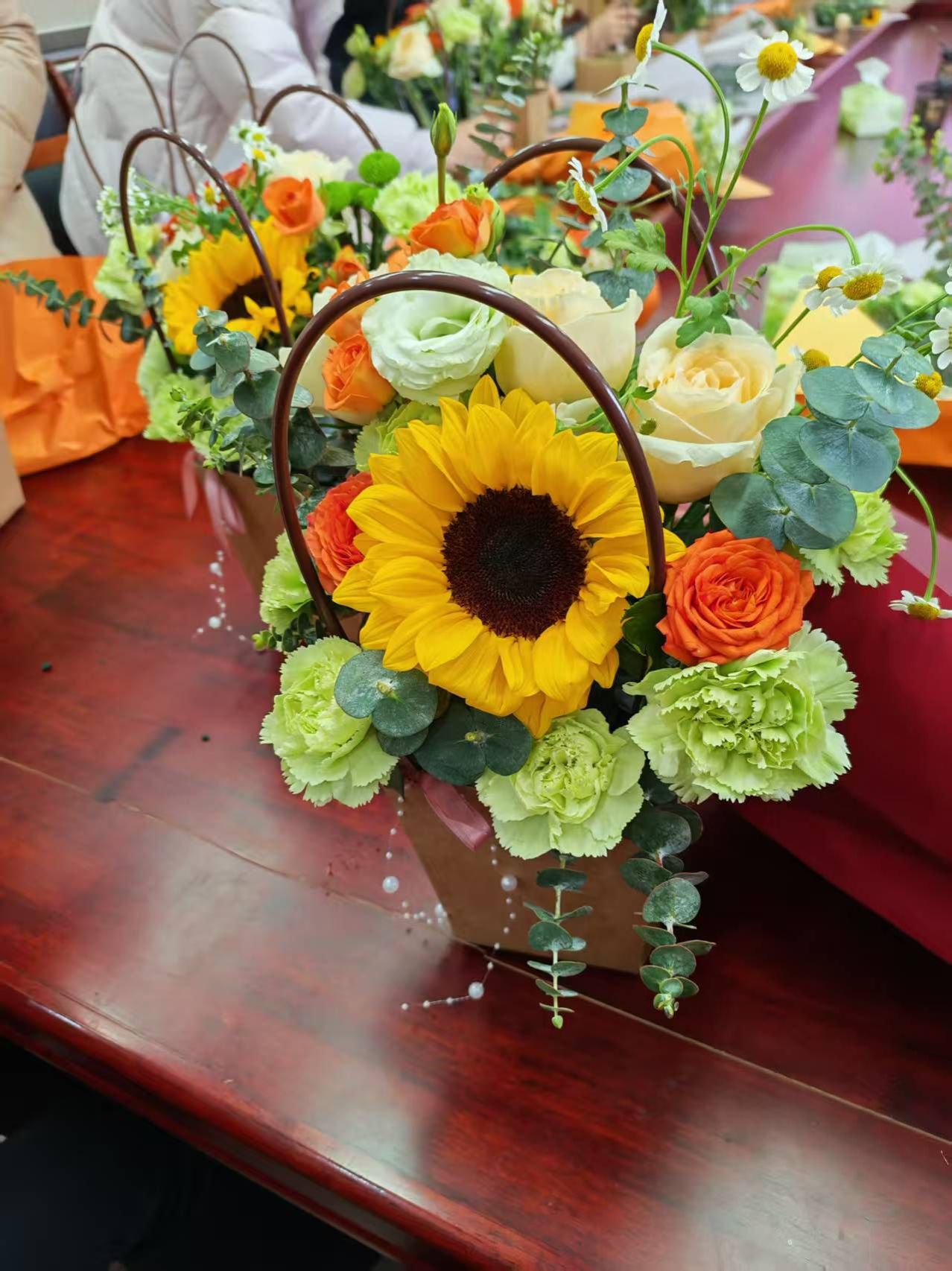 工会为大家准备了玫瑰、康乃馨、向日葵、洋桔梗、尤加利叶等丰富花材,并邀请专业花艺师现场指导。花艺师围绕插花的构图技巧、花枝修剪与层次营造等内容进行细致讲解,结合示范演示,手把手传授实操要点,让大家快速掌握插花基础要领。