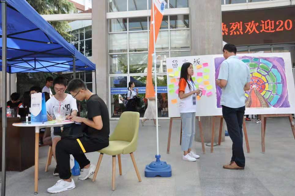 楼、南苑五号楼、华苑宿舍楼外设立了四个接待站点。前来的新生会在身穿红色小马甲的志愿者带领下来到报到点进行报到注册。同时在报到处设有茶水休息区,报到结束后,志愿者们还会为新生搬运行李,成为学校中一道靓丽的风景线。今年还设有系列特色活动一是“时光留言板”,新生们可于报到期间在留言板上写下对未来的展望,然后家长和新生在合影展板前拍照留念。二是“我来帮你解疑惑”,中文色情