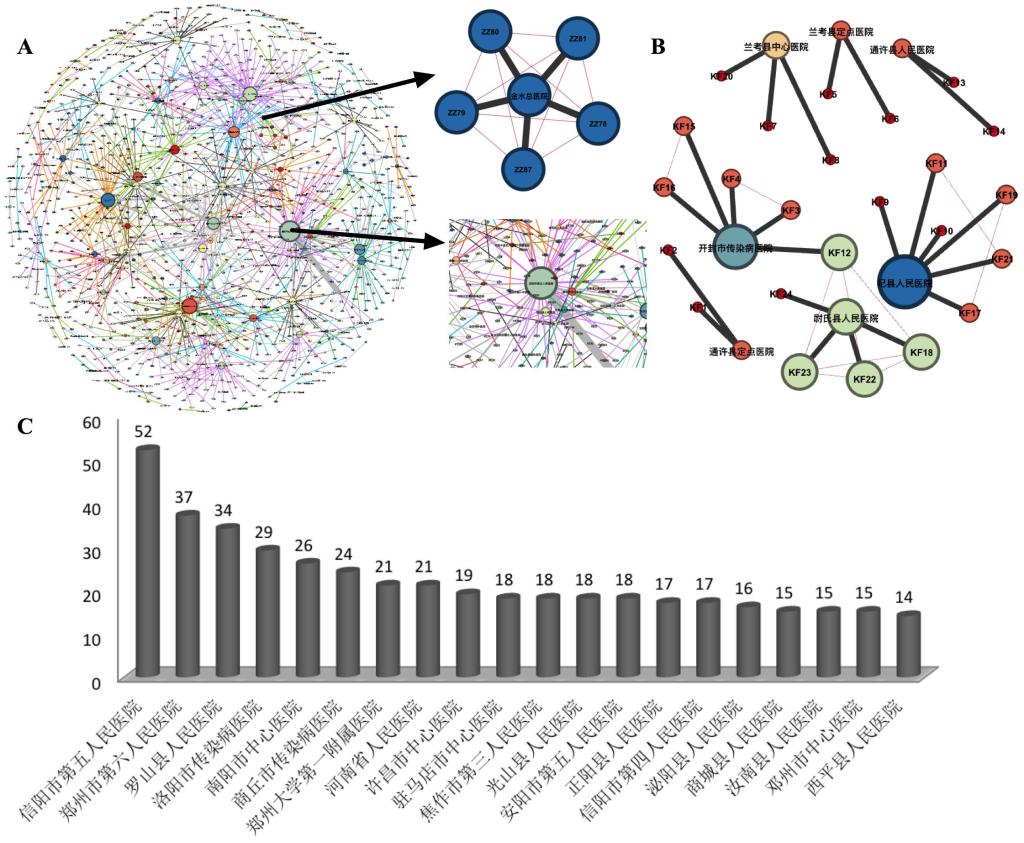 图5. 河南省18地市各医院收治病人及病人间聚集性网络分析。A. 河南省18地市医院与收治确诊病人间、医院间(转院)、病人间关系网络;A图右侧上方放大图展示了郑州市金水医院收治的5例亲属间传播网络图;A图右侧下方放大图展示了收治病人数最多的信阳第五人民医院;B. 开封市的网络;C. 河南省收治病人数量前20的医院病人数直方图。(注:本图仅根据网上报导的可查病例数据绘制并统计)