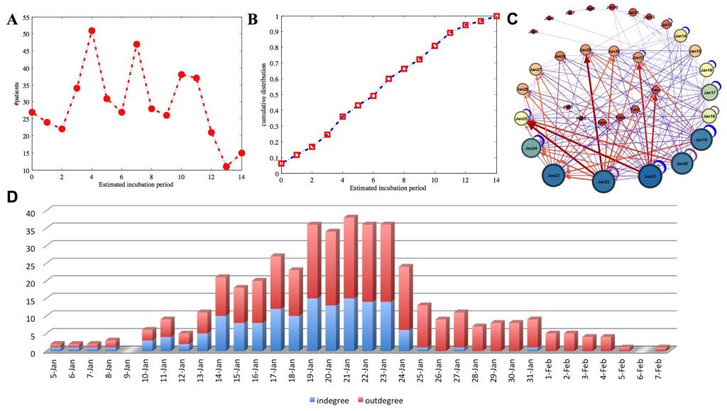 图3:河南报告病例中439例病人的估计潜伏期分布. A:潜伏期确诊病人数目分布;B:潜伏期从小到大确诊病人比例累积分布;C. 从暴露到患病人数转移图,图中节点大小和当天暴露人数和确诊人数之和成正比,边的粗细和人数成正比;D.从1月5日到2月7日每天转入转出人数分布。转入对应于患病,转出对应于暴露。