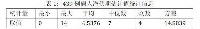 新冠肺炎病毒的潜伏期估计是一个比较困难的问题。难点在于发病时间是容易确定的,而感染时间却很难确定。下面,我们假定从首次接触可疑人员或从武汉返程(下称暴露)日期开始至出现身体不适的时间间隔为潜伏期。目前我们搜集的信息许多是几月几日离开武汉或接触武汉人员,几月几日发病。例如 南阳出现的第二例病例周某某的儿子在1月6日离开武汉到社旗家中,这时二人都没有感染,周某某2月3日发病,其儿子未患病;根据现有数据并不能排除周某某中间有接触其他的携带病毒者(传播链A到B到C的话,中间的B未知)的可能。如果简单地从1月6日到2月3日统计潜伏期,则为 28天, 这是不合理的。另外,由于本研究纯粹根据网络公布的患者描述信息而推测,不可避免会存在一定的偏差。根据我们搜集的数据,460例患者可以大致估计出潜伏期,以国家公布的14天潜伏期为依据,剔除大于14天的数据,对余下的439例数据进行统计分析,统计结果见图3。