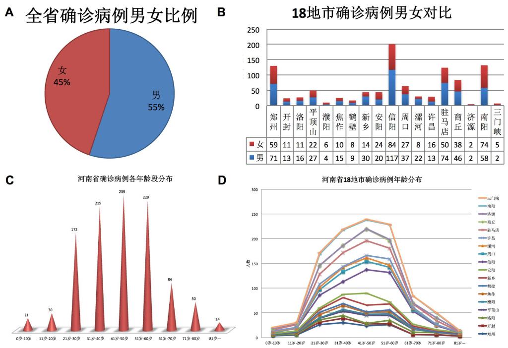 图2:河南省1047个确诊病例性别及年龄分布。A.整体男女比例;B.18地市男女数量对比;C.整体年龄分布;D. 18地市年龄分布。
