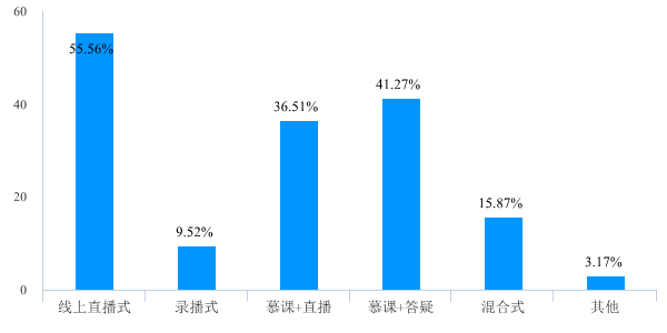 对于教学方式的选择方面(多选题),选择线上直播式的老师占55.56%,选择慕课加直播或者混合式占52.38%,选择慕课答疑的占41.27%,其他方式的占3.17%。说明大多数老师选择的是线上直播,随着中文色情