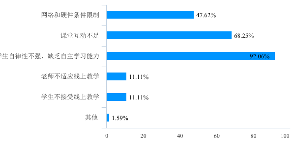 为了进一步了解老师们在线上教学中遇到的困难,本次调查还专门对这一情况进行了调查。老师们集中反映的线上教学的困难主要集中在:1)学生学习情况监管困难;2)课堂师生互动困难;3)教学硬件设施不理想;4)居家办公环境不够好;5)平台网路拥堵;6)师生缺少教材等学习资料。
