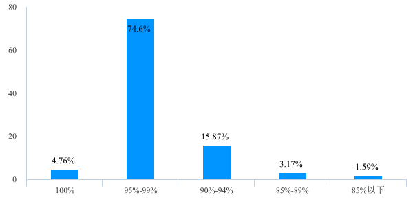 对于学生参与线上学习的积极性方面,79.36%的课程学生出勤率在95%以上,95.23%的课程学生出勤率都在90%以上,对于出勤率低于85%的课程,中文色情
