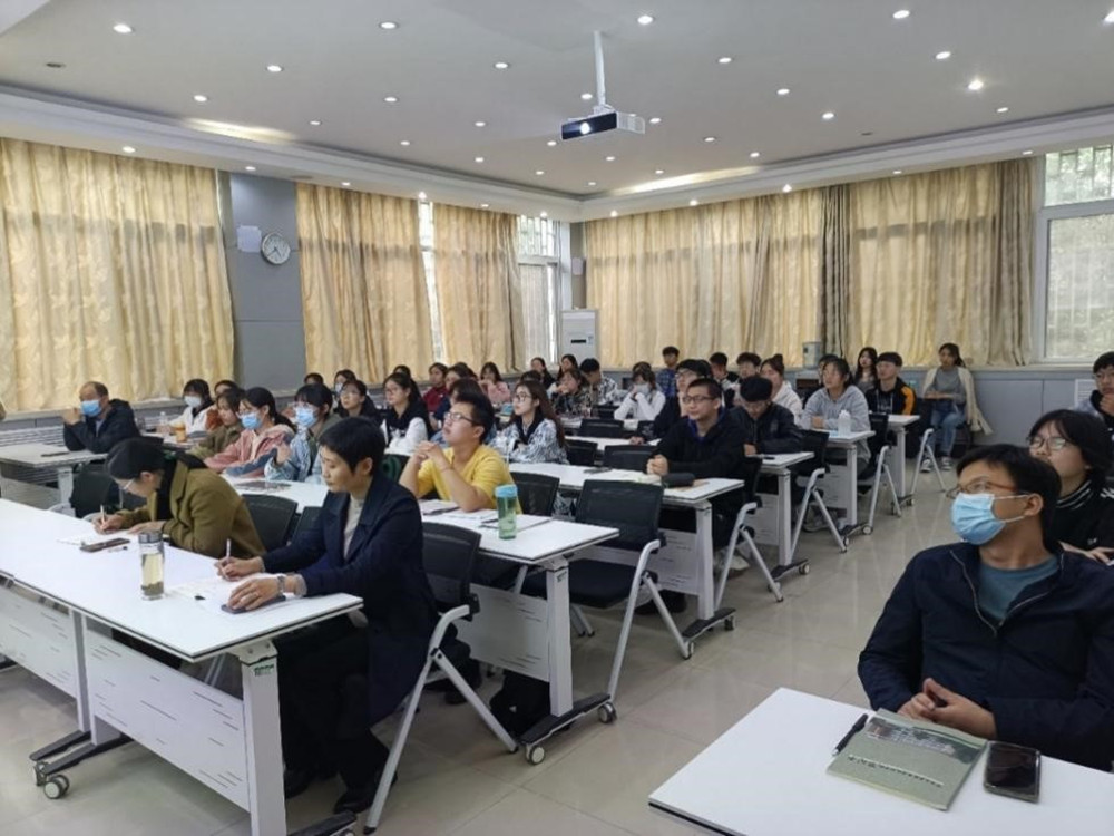 一楼报告厅和二楼第一教室两个分会场听报告。报告会由冯淑霞主持。