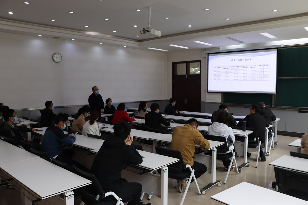 在一楼报告厅召开本科生班主任和辅导员联席工作会议,院长韩小森、党委副书记赵红磊、副院长王波、解俊山、唐恒才和各年级班主任、辅导员参会。