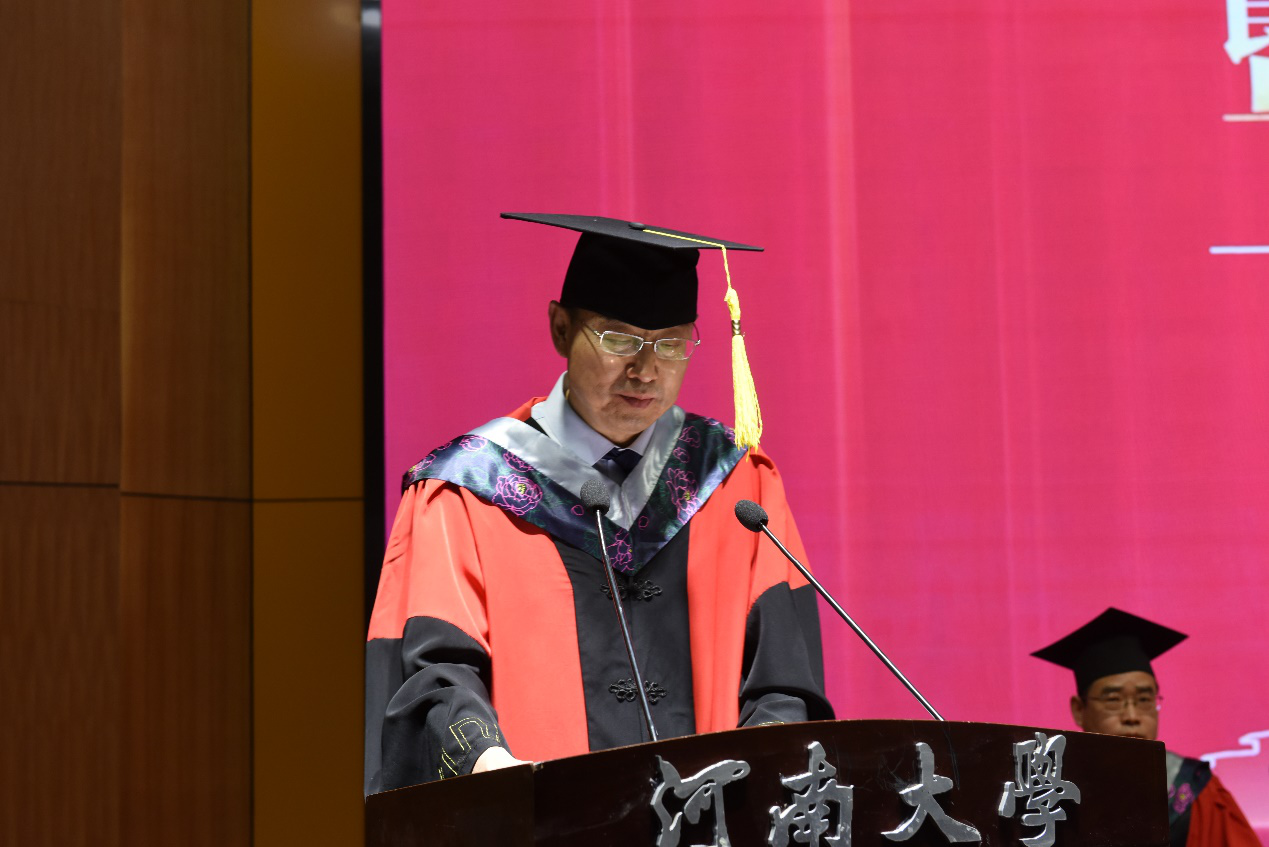冯淑霞向顺利完成学业的302名本科毕业生表示祝贺。她首先肯定了毕业生们在大学时光中对“明德新民,止于至善”校训的坚守,对“团结 勤奋 严谨 朴实”校风的传承。其次,她希望同学们珍藏大学时光,让这段经历成为他们今后攀登科学高峰、开创美好人生的宝贵财富;她希望同学们厚植河大文化,传承河大精神,勇敢面对困难,战胜各种挫折;她希望同学们坚定理想信念,牢记初心和使命,追求更加精彩、更有高度、更有境界的人生;她希望同学们坚持守正创新,不断追求卓越;练就过硬本领,锤炼高尚品质;勇于担当作为,甘于默默奉献。最后,她真诚祝愿同学们前程似锦,展翅飞翔,不负韶华!
