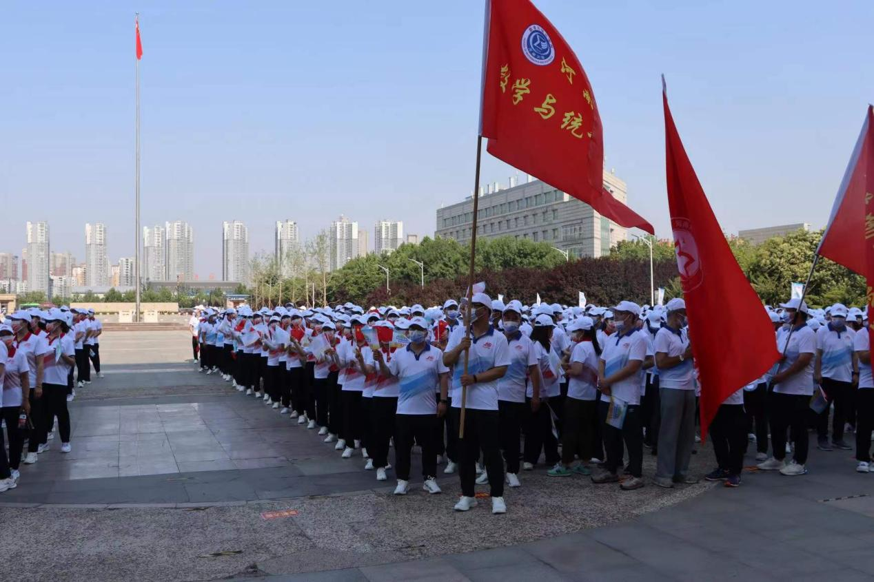 集合后,列队行进至金明校区图书馆广场,与其他单位教师一起等候活动开始。老师们身着纪念服饰,手拿国旗和活动旗帜,洋溢着幸福的笑容,渴望着用自己的脚步表达自己内心的喜悦。