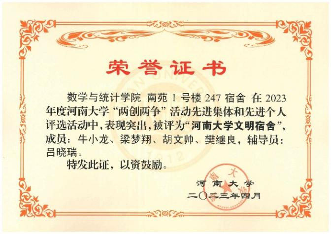 2023年度“两创两争”评选活动圆满结束,我院2021级研究生所在的南苑1号楼247宿舍荣获“中文色情